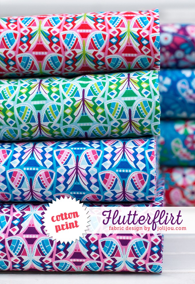 Flutterflirt ist im typischen Jolijou-Stil: graphisch aber dennoch verspielt und das Motiv erst auf dem zweiten Blick erkennbar. Ich wollte ein Schmetterlings-Design entwerfen welches nicht kitschig sondern modern wirkt, ich hoffe es ist mir gelungen! Flutterflirt ist in den Farben Marine, Türkis, Rot und Lila erhältlich und auf einer hervorragenden Popeline-Qualität gedruckt die sich prima für Kleidung aber auch Taschen, Accessoires und vieles mehr eignet.