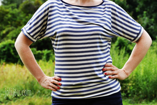 Ja, auch das ist Tara! (Ich sag’s ja: Schnitt im Schnitt). Denn wenn man das Rückenteil der Fledermaus-Variante zweimal zuschneidet bekommt man ein tolles Uboot-Shirt. Hier in der kurzen Variante und den Halsausschnitt etwas verbreitert (wie, steht in der Anleitung), ein breites Bündchen dran und fertig ist das neue Lieblings Tee.