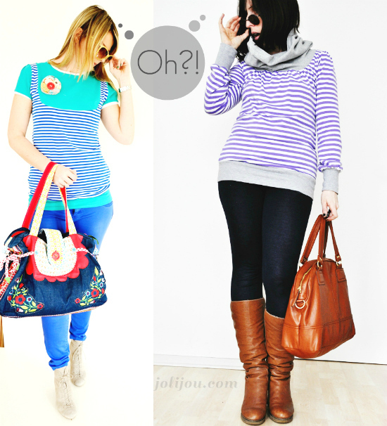 Kollegialität war mir bei meiner Arbeit schon immer wichtig, deswegen zeigen wir hier nicht nur unser neues Schnittmuster Ebook Shelly sondern auch das von Claudi. Sie hat nämlich aus ihrem tollen Kinder-Schitt Lina das Damen-Schnittmuster MAlina gemacht. Die beiden sind aber nur auf dem ersten Blick ähnlich. SHELLY ist vorne gerafft und kann mit oder ohne großen Rollkragen genäht werden und MAlina hat den süssen Retro-Einsatz und fällt schön körperanliegend. Aber morgen mehr dazu…. Genießt erst mal unsere verrückte Foto-Reihe, wir hatten unglaublich viel Spaß daran. Gacker!Die beiden Ebooks erscheinen am nächsten Donnerstag. SHELLY bei uns im Jolijou-Shop und MAlina bei Claudi. Claudis Tasche ist übrigens eine FLORABELLA!! Wir wünschen euch ganz viel Freude damit!