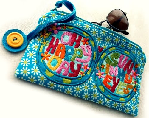 Der Hauptgewinn ist ein kleines Sonnenbrillentäschchen verziert mit der Sonnenbrille aus meiner neuen Stickdatei. Kuschelig mit Volumenvlies verstärkt damit das Brillchen gut geschützt ist. Innen mit kleinem verschließbarem Innenfach für den Notgroschen. Am Reissverschluss eine lange Samtschlaufe damit man das Täschchen bequem über dem Handgelenk tragen kann. Die Schlaufe ist mit einem kleinen Lederbutton mit buntem Vintage-Knopf versehen. In dem Täschchen versteckt sich für den Gewinner ein längeres Stück Lotzadots und es gibt einen Stapel bunter Jolijou-Postkarten sowie ein Notizblock mit Jodelrehmotiv dazu.