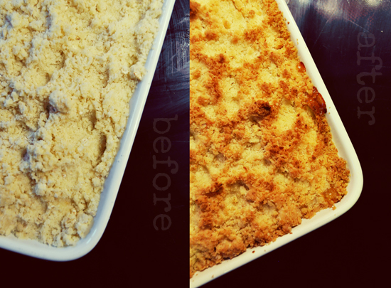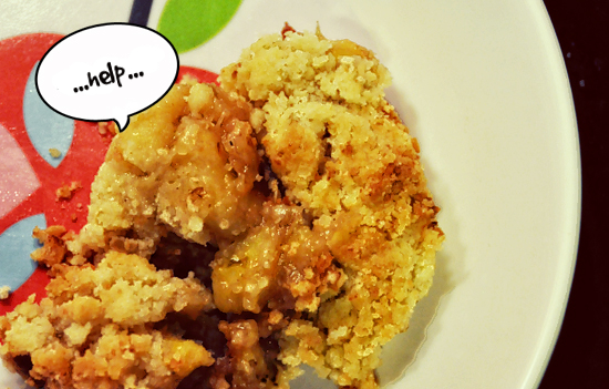Beim letzten Sonntagssüß bin ich über diesen Beitrag gestolpert. Lecker! Schwupps in die Küche gerannt, die Bananen kleingeschnibbelt, in Butter und Ahornsirup kurz angeschwitzt, in die Form gegeben und das Crumble von meinem Apple Crumble Rezept darüber gestreut. Fertig. Lecker! Ein weiteres Banana-Drama mit einem Happy End…naja, zumindest für uns 🙂