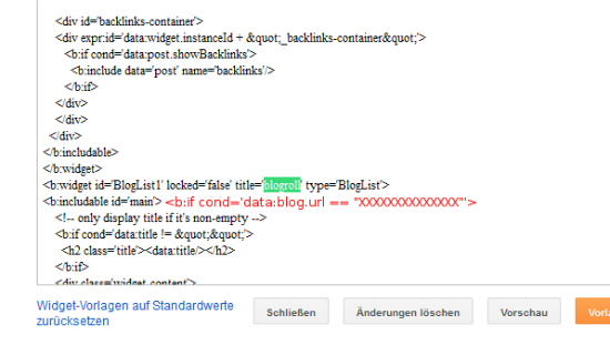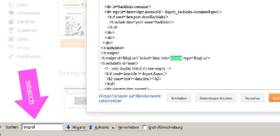 dazu gebt ihr in der Suchleiste BLOGLIST ein…bis ihr die Zeile <b:widget id=’BlogList1′ locked=’false‘ title=’blogroll‘ type=’BlogList‘> gefunden habt.