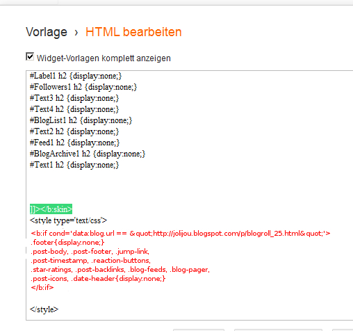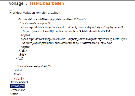 Zurück zum HTML-Code. Dort suchen wir nach ]]></b:skin>. Dahinter fügen wir diesen Code ein: