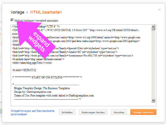 Eure Blogroll erscheint nun unterhalb der Posts bzw. unterhalb aller Seiten, aber das wollen wir ja nicht, sie soll ja nur auf der gerade erstellten „Blogroll-Seite“ erscheinen. Das müssen wir unserem Blog nun sagen. Also wechseln wir auf „Vorlage“ und wählen „HTML-Bearbeiten“, klicken im Popup-Fenster auf „Fortfahren“ und befinden uns im HTML Code. Dort ist es zunächst wichtig, dass wir das Kästchen „Widget-Vorlagen komplett anzeigen“ aktivieren.