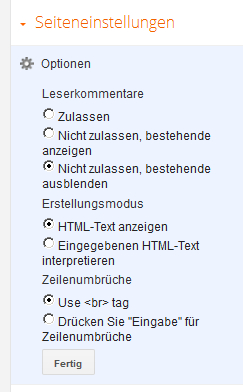 Dann geht ihr im Dashboard auf „Seiten“ und erstellt eine neue Seite. Als Titel gebt ihr euren Wunschnamen, also Blogroll, meine Lieblinks, oder wie er sie eben nennen mögt, ein. Auf der rechten Seite seht ihr den Reiter „Seiteneinstellungen“. Dort klickt ihr „Optionen“ an und wählt „Leserkommentare nicht zulassen, bestehende ausblenden“. Die Seite speichern, bzw. veröffentlichen.