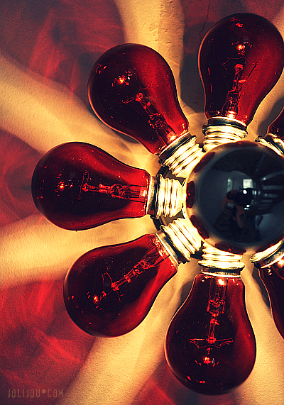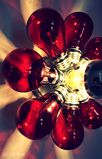 The mister and I have a thing for lights. We love eccentric lighting. This one is my favourite at the moment. The name REVOLVER itself promises ultimate seventies feeling. The best thing is the flower shape it throws on the wall merely through the reflections of the red ligth bulbs surrounding the inner bulb (which is in fact the only one lit).