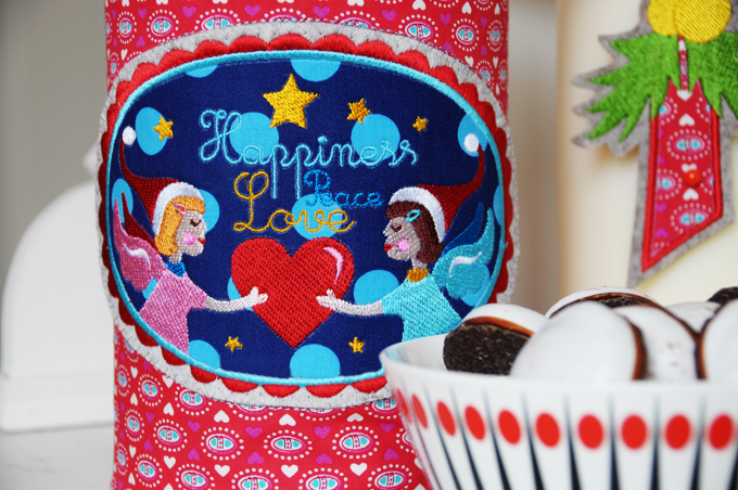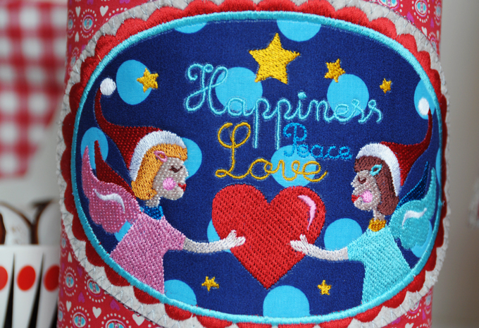 Vorne mit dem Happiness, Peace, Love Motiv aus der Share Love Stickdatei, ebenfalls am 15. November bei Huups erhältlich. Die Zeichnungen sollen daran erinnern, zu Weihnachten vor allem Liebe zu teilen, ist dadurch auch ein Motiv für das ganze Jahr finde ich.