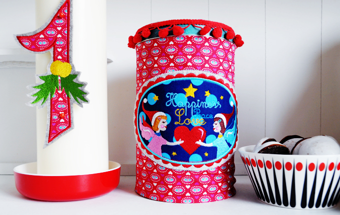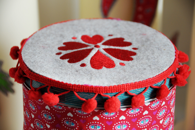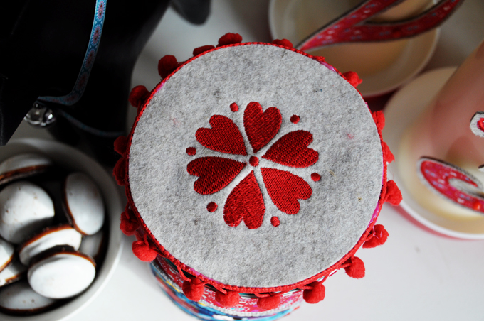Für den Deckel habe ich das Herzmotiv aus der Share Love datei auf hellgrauem Wollfilz gestickt, mit Heißkleber auf den Deckel geklebt und mit Pompomborte verziert. Zu Weihnachten darf es ruhig ein bißchen kitschig sein nech?