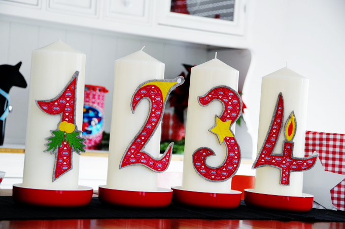 Ich habe dieses Jahr vier Rieeeesenkerzen und vier kleine rote Schüsselchen (die eigentlich für die Küche gedacht sind und mit Deckel kommen, prima, dann haben sie auch jenseits von Weihnachten noch einen Sinn!) bei Ikea gekauft. Die Zahlen sind aus der neuen Stickdatei Jahreswechsel die am 15. November bei Huups erscheint. Ich habe sie auf grauem Wollfilz gestickt und mit kleinen bunten Reißnägel an die Kerzen befestigt.
