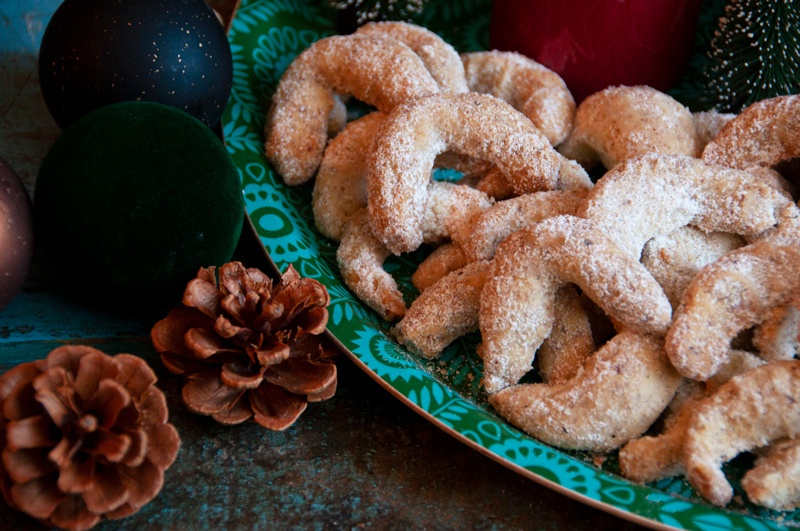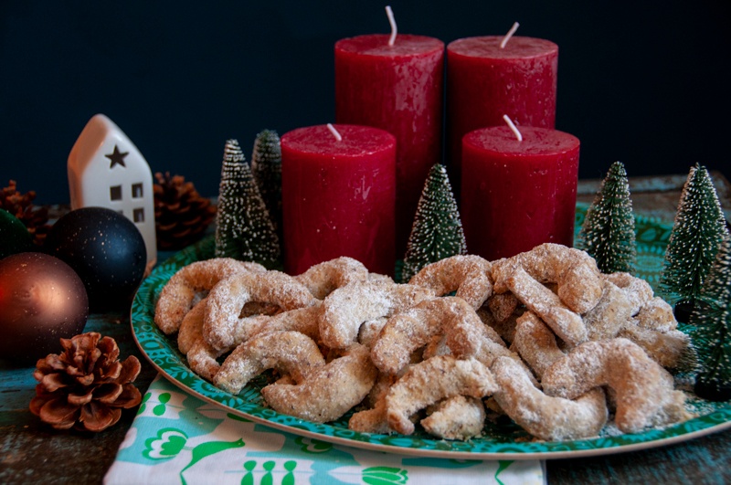 Die Kipferl aus dem Ofen holen und eine Minute kurz abkühlen lassen. Dann werden sie ganz vorsichtig in der Zuckermischung gewendet und gewälzt bis sie vollständig bedeckt sind. Auf einem Kuchengitter vollständig auskühlen lassen und anschließend in einer Keksdose aufbewahren. Am Adventssonntag werden sie auf einem hübschen Tablett präsentiert.