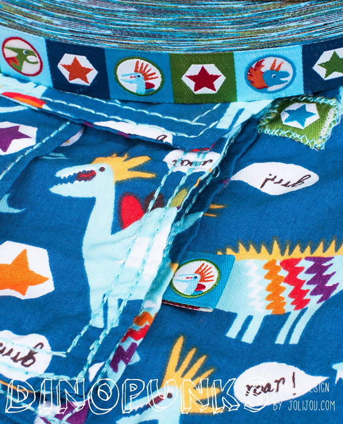 The lovely lady who sewed the dress I showed you yesterday didn’t stop there. She also made this cute little children’s backpack from Hexastars Turquoise and Dinopunks in Blue. I’m so in love with this little piece I’d actually love to keep it for my little four year old. Did you catch the little tiny bit of ribbon poking into the picture and asked yourself if it was a new one? Well you’re right, it is a brand spanking new design to go with the Dinopunks fabric collection.