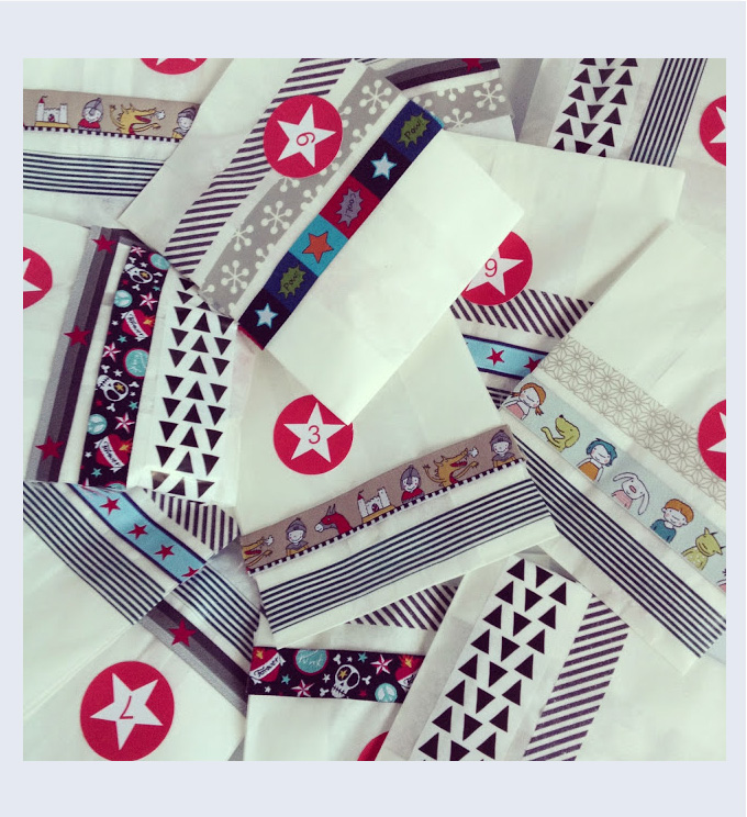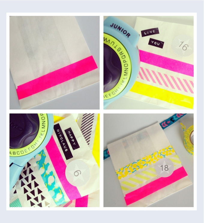 Dann habe ich die Tütchen gefüllt, in die Hälfte geknickt und mit Tape, Dymo-Schriftzügen, Webbänder und coole Zahlensticker (meine sind von hier) versehen. An der Knickstelle jeder Tüte habe ich einen Tunnelzug gelassen und am Ende alle Tüten auf ein langes Stück Webband aufgefädelt.