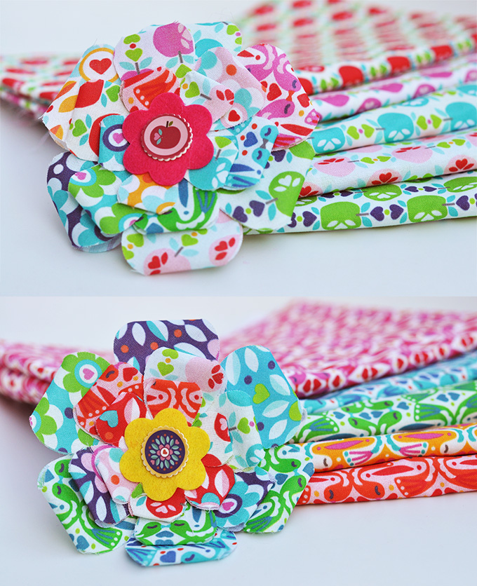 Man könnte die einzelnen Blüten natürlich auch mit der Heißklebepistole direkt auf ein rundes Stück Filz kleben, was ich beim ersten Mal auch gemacht habe, aber ich finde es geht einfacher und fingerschonender wenn man sie auf eine Mustelbeutelklammer auffädelt. Beim ausstanzen mit der Bigshot ist dafür bereits ein kleines Loch gestanzt. Dabei ist das flache Ende der Klammer später oben. Man fängt also mit der kleinsten Blüten-Größe an und fädelt jeweils sechs auf, dann kommt die mittlere Größe mit sechs Blüten und zuletzt die größte Größe auch sechs Mal. Wenn alle Blüten aufgefädelt sind spreizt man die Klammer hinten auseinander und klebt den großen Filzkreis mit der Heißklebepistole an, so dass die Klammer darunter verschwindet. Darauf kommt nun die Broschenklammer, und auf der Vorderseite mittig die Filzblume und der schöne Knopf – ebenfalls mit der Heißklebepistole. Fertig ist die Brosche! (Kleiner Tipp: wenn man den Stoff vor dem Stanzen/Schneiden mit Vlieseline verstärkt franst die Blume nicht aus).