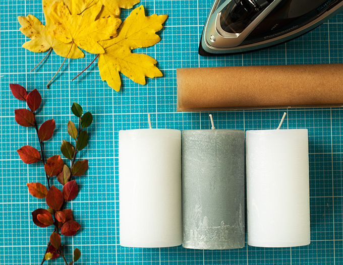 Ihr braucht: ein paar schöne Herbstblätter, Kerzen, Backpapier und ein Bügeleisen.