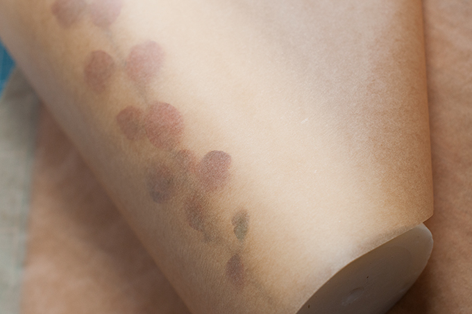 Darüber kommt eine Lage Backpapier und dann bügelt ihr ganz vorsichtig mit der Spitze des Bügeleisens die Blätter fest. Das Wachs darunter schmilzt ganz schnell also zügig und vorsichtig arbeiten.