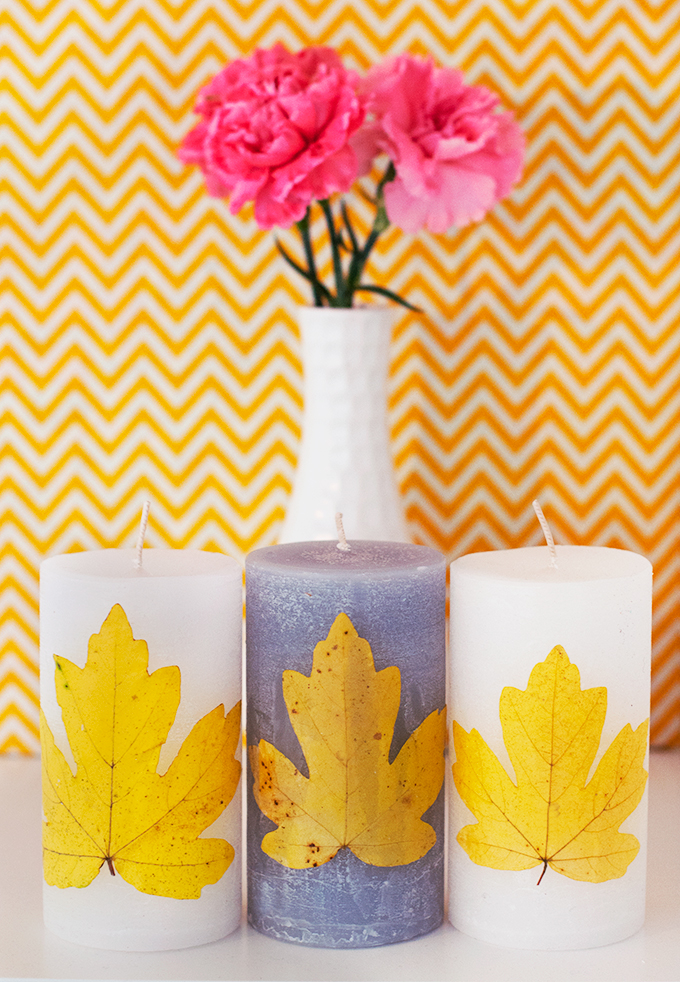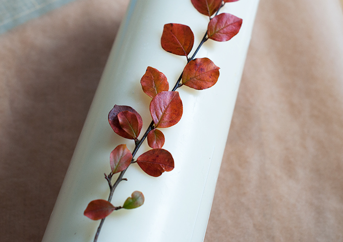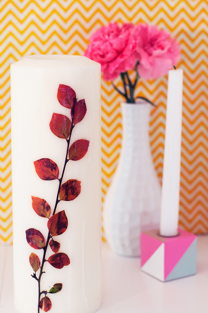 When I got home I thought about how nice it would be to somehow preserve them a little longer. And because a even a few days more down the track I had picked up a couple of white candles (you know, it’s that time of year where you randomly buy candles and other christmassy stuff right?) I had the idea to decorate them with the leaves I had collected.