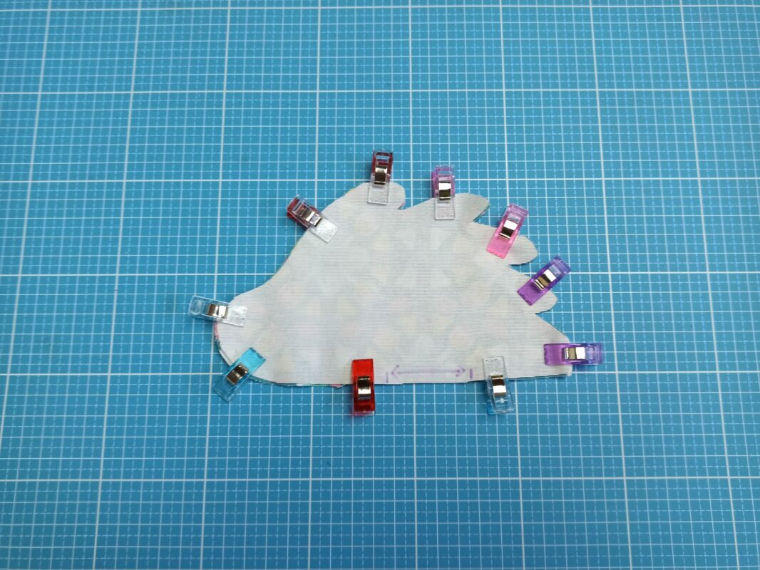 Schritt 2: Lege die Vorlage, die du nutzen möchtest, auf deinen doppelt gelegten Stoff. Stecke sie fest und schneide den Stoff passend aus. Achte darauf, dass die Vorlage KEINE NAHTZUGABE enthält, d.h. du musst deine Nahtzugabe noch hinzufügen (ich habe eine NZ von circa 1 cm verwendet).