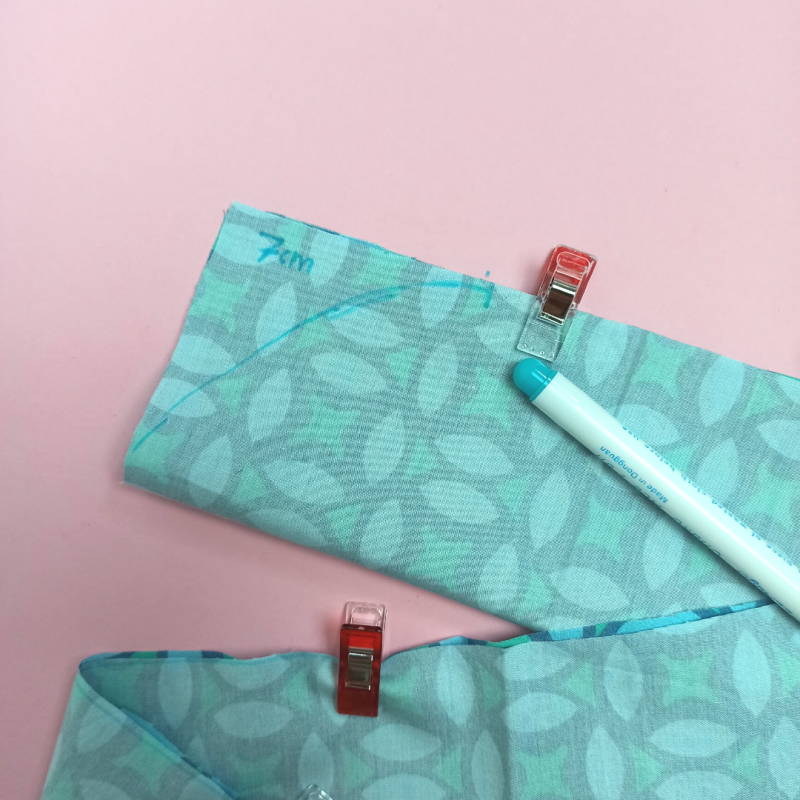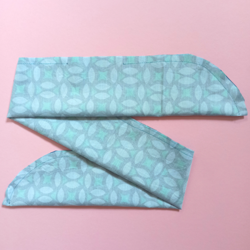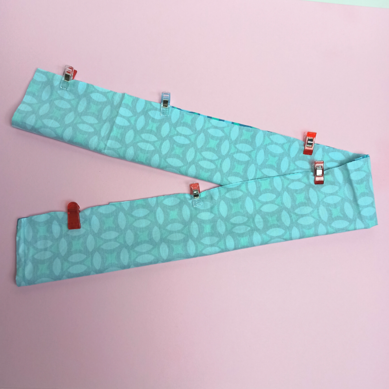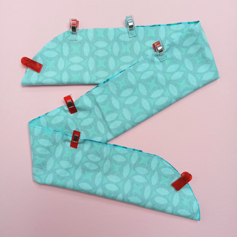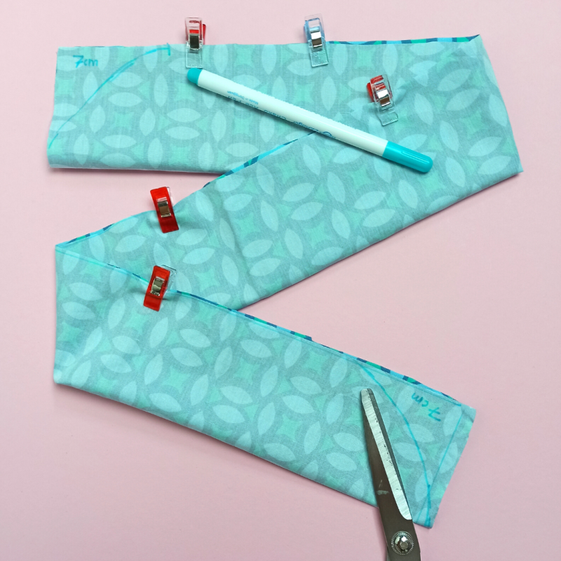 Lege den Stoffstreifen entlang der langen Seite rechts auf rechts (also die schöne auf die schöne Seite). Stecke die offenen Stoffenden mit den Stecknadeln/Stoffklammern zusammen. Schneide nun entlang der kurzen Enden des Stoffstreifens, sodass eine Rundung entsteht.