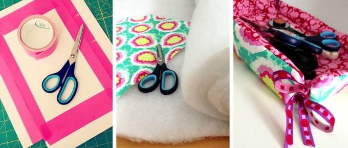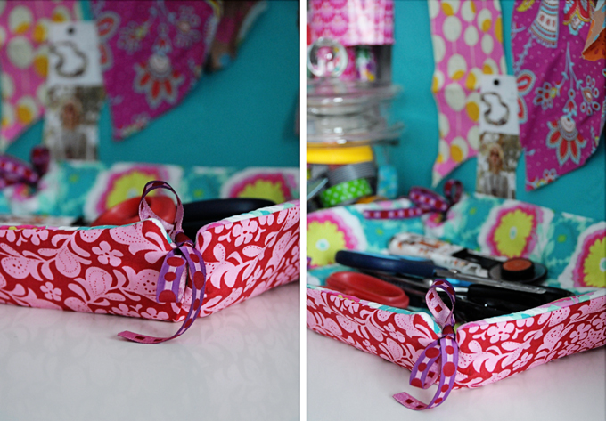 Ich bin zwar im großen und ganzen schon ziemlich zufrieden mit meinem Arbeitszimmer aber hier und da fehlen noch ein paar kleine Details. Heute habe ich endlich für meine Scheren ein hübsches kleines Zuhause gebastelt. Ich glaube sie freuen sich, dass sie auf Amy Butler schlafen dürfen.