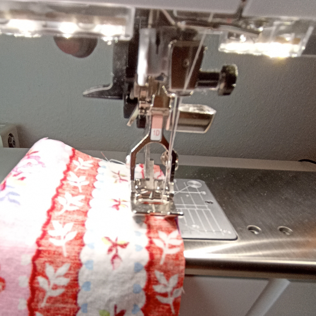 - Nähe das lange, offene Ende mit einer Nahtzugabe von 0,5 cm mit einem Geradstich zusammen