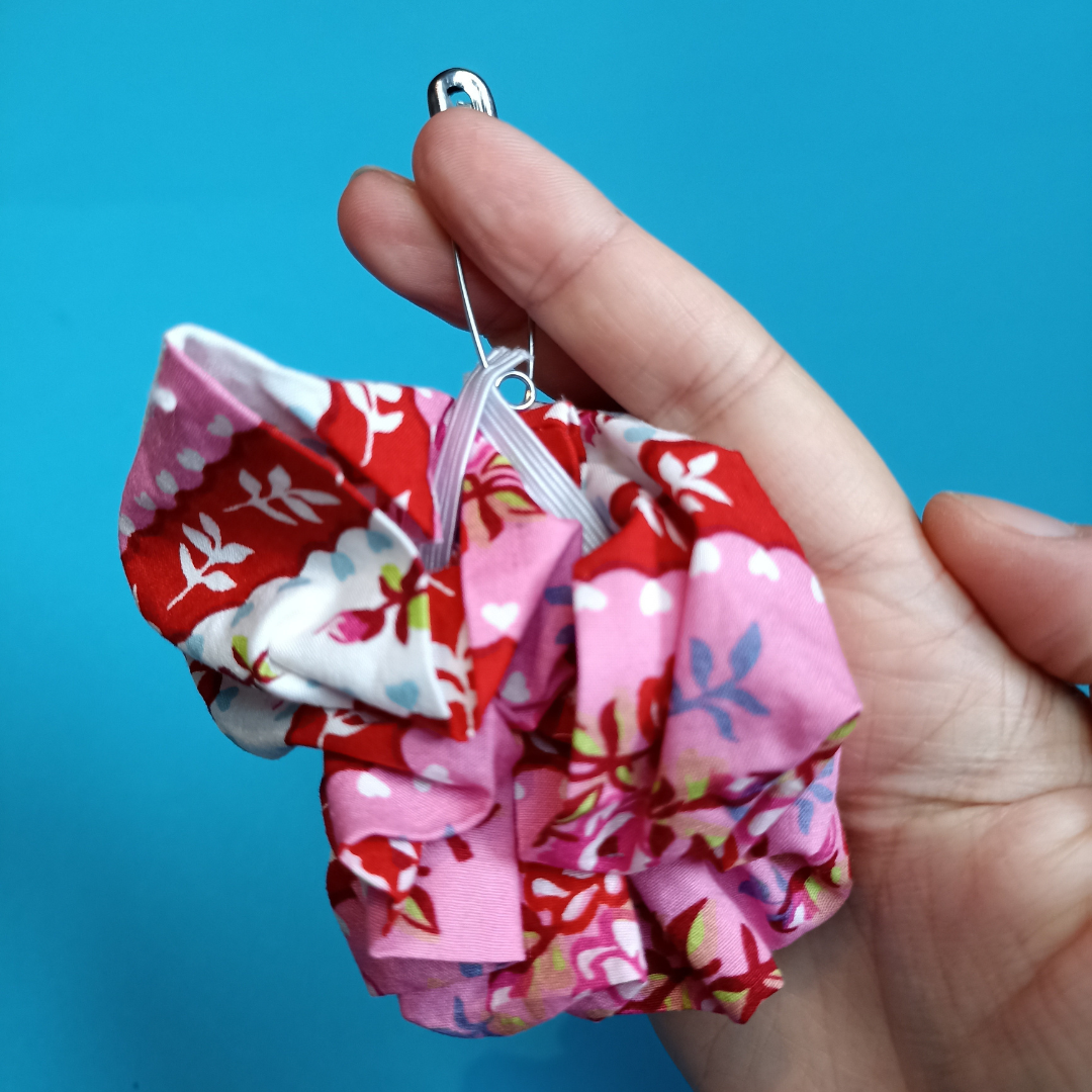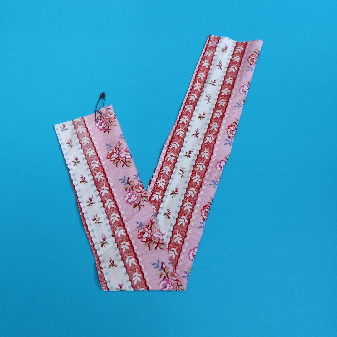 - Fädele das Gummiband mithilfe der Stecknadel durch den eben gewendeten Stoffschlauch.
