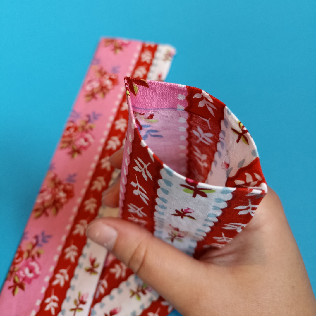 - Falte den Stoff an der langen Seite entlang, sodass er rechts auf rechts liegt (also die schöne auf der schönen Seite)