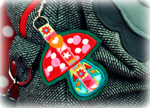Nach einer Idee von Sabine und Diba und ganz wunderbar digitalisiert von Jeanette. Ich hab nur die Vorlagen gezeichnet. Das Besondere an den Motiven ist, dass ein Webband direkt mit festgestickt wird und als Aufhängeband verwendet werden kann. Dadurch ergeben sich irre viele Einsatzmöglichkeiten. Ob als Geschenkanhänger, Taschenbaumler, Schlüsselanhänger oder Christbaumschmuck durch das Verwenden verschiedener Bänder entsteht jedes Mal ein ganz anderer Look. Hier peppt das Pilz-Motiv meine neue Tasche ungemein auf :o)