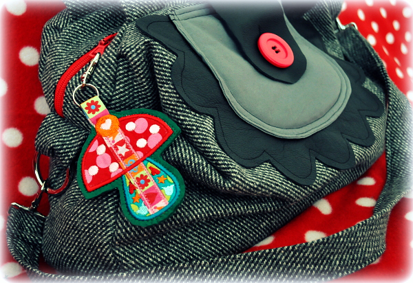 Nach einer Idee von Sabine und Diba und ganz wunderbar digitalisiert von Jeanette. Ich hab nur die Vorlagen gezeichnet. Das Besondere an den Motiven ist, dass ein Webband direkt mit festgestickt wird und als Aufhängeband verwendet werden kann. Dadurch ergeben sich irre viele Einsatzmöglichkeiten. Ob als Geschenkanhänger, Taschenbaumler, Schlüsselanhänger oder Christbaumschmuck durch das Verwenden verschiedener Bänder entsteht jedes Mal ein ganz anderer Look. Hier peppt das Pilz-Motiv meine neue Tasche ungemein auf :o)