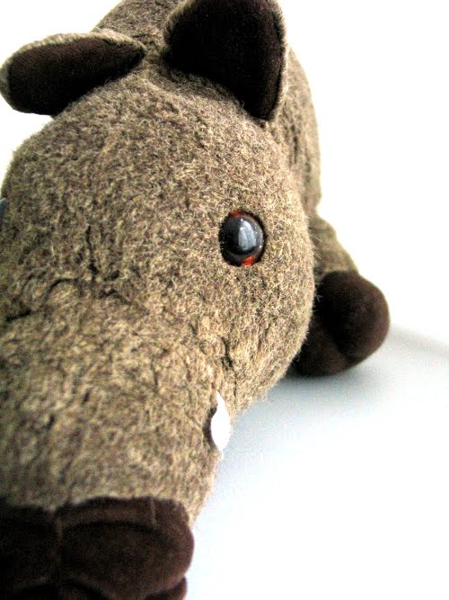 The Mr. thinks he looks more like a sheep than a wombat. I think he could well do with another set of legs (I have to get my sewing brain around that first), and must admit he’s not the handsomest of guys. Nevertheless Mr. 00Wombi has completely stolen our hearts with his gullible charm and we have officially adopted him.