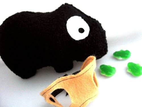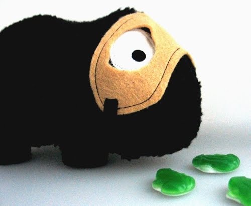 Herr Müller meinte ja, er sähe eher aus wie ein schwarzes Schaf. Ich finde auch, er ist vielleicht nicht der hüpscheste, und dass er gut und gerne ein zweites Paar Beine brauchen könnte (da muss ich mein Nähhirn erstmal drumrum kriegen), aber der kleene 00Wombi hat uns mit seinem treudoofen Blick voll um den Finger gewickelt und wir lieben ihn jetzt schon. Der kleinste Herr Müller sogar so sehr, dass er ihm seine Maske abzieht und innbrünstig daran nuckelt.