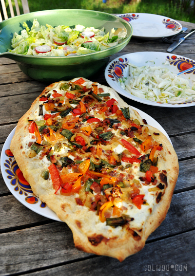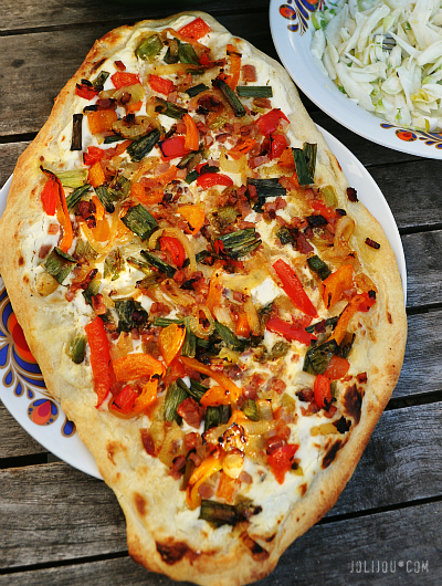 Preheat oven to 250°C. Cut dough into 4 portions and roll out very thin. Spread cheese-mixture on nice and thickly, leaving out the edges and sprinkle on topping generously. Bake for about 10-15minutes or until the edges are nice and brown.