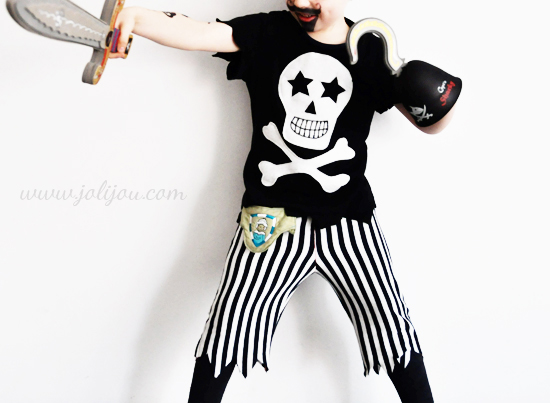 Naja, eher ein Fluch für die Eltern oder? Aber dank des tollen Schnittmusters Machmalhalblang war die Piratenhose in nullkommanix genäht. Einfach den Jersey längsgestreift nähen. Es war allerdings schon ein bißchen komisch, die Hose nicht zu säumen sondern am Ende Zacken reinzuschneiden. Auf ein altes T-Shirt von mir kam ein selbstgezeichneter Totenkopf mit Sternenaugen. Die hatte mein Sohn auch nachdem er das Outfit gesehen hatte und dafür lohnt sich der Fluch mit dem Fasching allemal 🙂