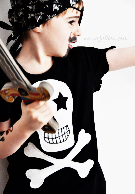 Pirate of the Carnivalean. In Germany it’s a custom to celebrate carneval or fasching as it’s called here, everyone get’s dressed up and goes out for a party. It’s actually not really my cup of tea but the kids love it. Thanks to the very simple pattern Machmalhalblang I had the pirate shorts whipped up in no time. It was a bit strange to sew the stripes vertically and then cut zigzags instead of seaming them at the end. I cut up an old black t-shirt of mine and appliqued a big starry-eyes skull I had sketched for the occasion. And on „Fasching“ I had one proud little starry-eyed boy when he saw the outfit, so it was definitely a all worth the while!