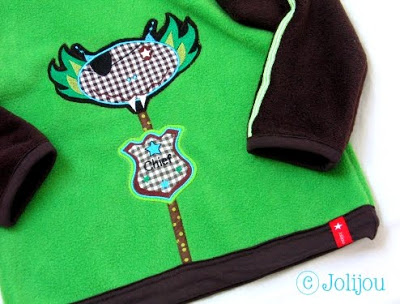 …aus kuscheligem braunem und grünem Fleece…die Abschlüsse aus braunem Jersey….