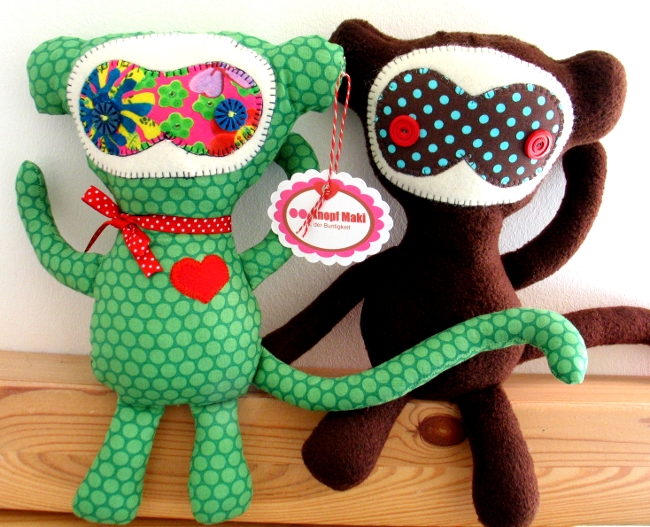 Diese kleinen Knopfmakis sind dieser Tage als Geschenk für zwei liebe Nähmeisenkolleginnen entstanden. Obwohl es tierisch Spaß gemacht hat, hatte ich mir während des Zusammennähens des Korpus‘, in dem alle ausgestopften Extremitäten innen liegen, eigentlich fest geschworen, so schnell kein Maki mehr zu nähen, aber irgend jemand muss doch jetzt Glücksfee spielen……mmmmh na mal sehen…..
