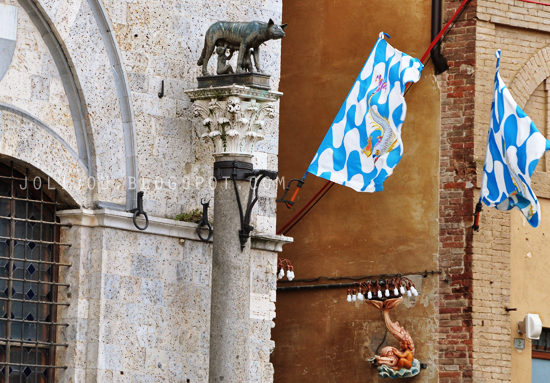 Auf den Palio sind die Sienesen sehr stolz und überall hängen die blau-weißen Fahnen des diesjährigen Gewinners, die Onda (Welle). Die Stadt ist nämlich – auch geographisch – in 17 Teilen (Contrade) eingeteilt, jedes mit ganz eigenen Bräuchen und Traditionen. Die jeweiligen Contrade erkennt man beim Rundgang durch die Stadt an den verschiedenen Tieren, Wappen und Fahnen die sie Kennzeichnen und es macht großen Spaß, sie zu entdecken. Vor jedem Rennen wird per Los entschieden welche Contrade teilnehmen und gegeneinander antreten dürfen. Im Vorfeld gibt es zahlreiche Feierlichkeiten die sich weit über das Rennen hinaus erstrecken und Siena an den Tagen um das Rennen in einen Ausnahmezustand versetzen.