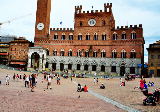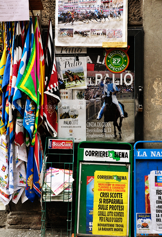 Ich hatte mich im Vorfeld schon ein bißchen über Siena informiert. In diesem Buch geht es in erster Linie um das berühmte Pferderennen, dem Palio, das jedes Jahr dort, mitten in der Stadt, und zwar um den Hauptplatz, dem Il Campo, stattfindet.
