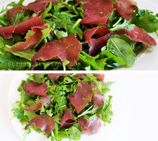 2-3 Scheiben Bresaola-Schinken in Stücke reißen und darauf verteilen. Bresaola ist ein luftgetrockneter Rinderschinken und vom Geschmack mild und zart und besonders in Kombination mit Parmesan und Rucola ein Hochgenuss!