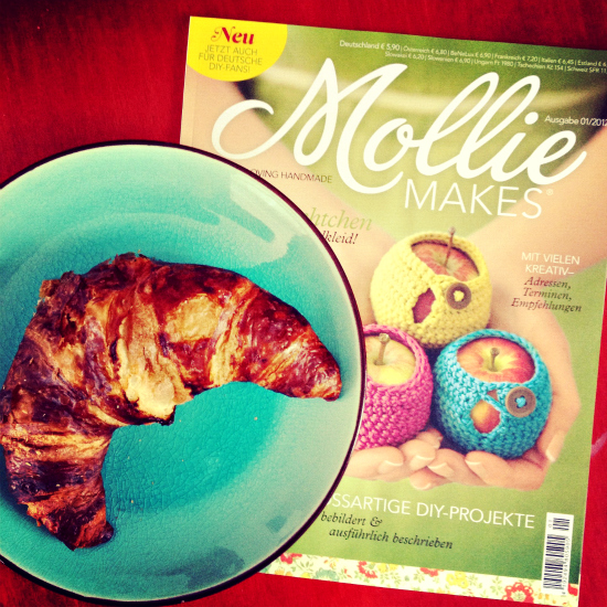 Dieses Foto muss ich euch noch etwas genauer zeigen. Denn zum zweiten Frühstück heute morgen gab es neben einem Laugen-Croissant zum drölfzigsten Mal – weil ich sie mir immer wieder greifen muss – die wunderbare Erstausgabe der deutschprachigen Mollie Makes. Was für ein inspirierendes Heftchen! Ich hatte da auch schon eine Idee…