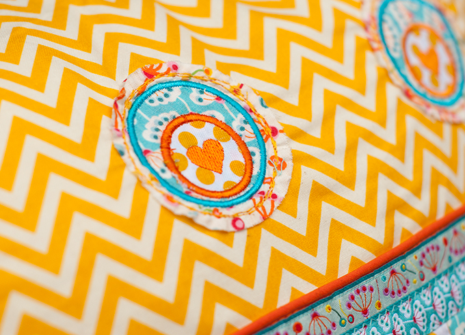 Genäht habe ich es aus übriggebliebenen Streifen vom Quilt. Die Rückseite ist ebenfalls ein Swafing-Stoff, genauso wie der weiß-gelb Gepunktete und der weiß-gelbe Chevron. Diesmal aber mit mintfarbener Paspel und den einfachen Pustekreisen aus der Stickdatei, sowie die neuen Webbänder und wenn ich sehe wie es auf meinem grauen Sofa leuchtet habe ich definitiv Frühling im Herzen.