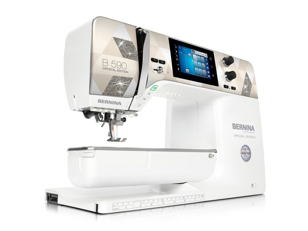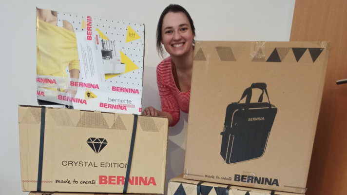 Kira näht mit einer Bernina B590 Crystal Edition Nähmaschine. Sie ist von einer sehr preiswerten Maschine auf diese Maschine umgestiegen und sagt, es ist ein Unterschied wie Tag und Nacht, wie Billig-Fahhrad versus gutes Mountainbike. Die Maschine rattert durch jedes Material wie Butter!