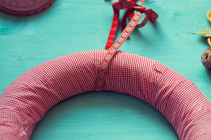 Zuerst bewickelt ihr den Kranz mit den Stoffstreifen oder dem Band damit von dem weißen Styropor später nichts durchscheint. Dann bringt ihr eine Schlaufe zum Aufhängen an. Das sollte man unbedingt jetzt machen, da es später wirklich schwierig wird nachträglich anzubringen.