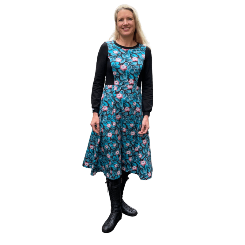 Tina hat die Teilungen des Kleides verwendet um Jill aus unterschiedlichen Stoffen zu nähen. Dadurch sind zwei einmalige Kleider entstanden!