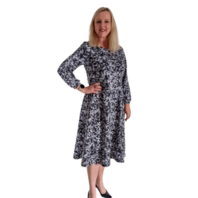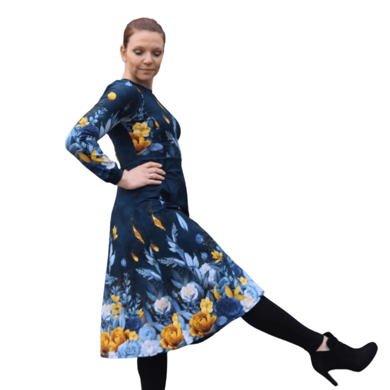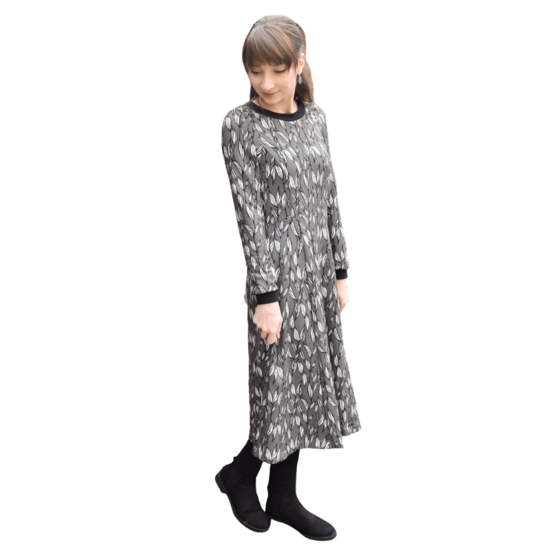 JILL ist ein wandelbares, langärmeliges Kleid, mit einem länger geschnittenen Rock.
