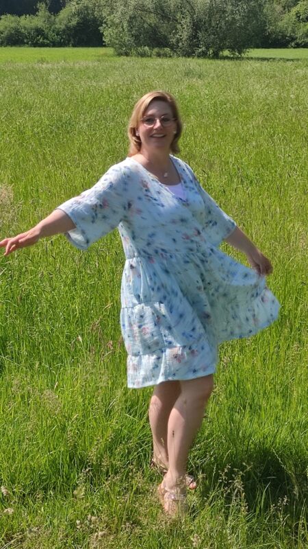 Kerstin hat ihre Juni aus Musselin genäht. Somit ist ein wunderschönes und besonders luftig und weiches Sommerkleid entstanden.