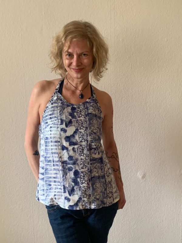 "Shiva ist aus Webware ein super luftiges Sommertop, das durch die Raffung im Rücken und die verschiedenen Trägermöglichkeiten ein echter Hingucker ist."