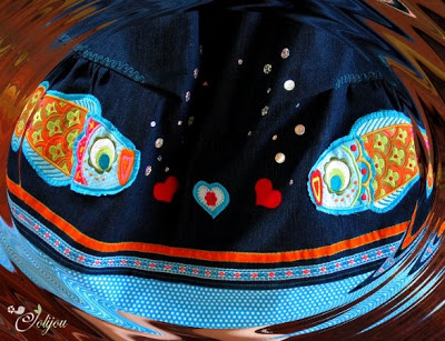 Nic & Jeanettes neue Serie ist der Wahnsinn! Ihr werdet sehen, die Ideen wachsen und wachsen….Hier habe ich die große Fisch-Applikation auf blauem Popeline gestickt und dann aufgenäht….Achtung! Den Fischkopf für zwei sich zuschwimmende Fische einmal spiegelverkehrt sticken, sonst ist einer falsch herum und es muss nochmal gestickt werden wie bei mir ;o) Den Extra-Fischkopf habe ich einfach auf das Shirt gestickt und mit bunten Baumelbändchen verziert…wir sind ja flexibel!