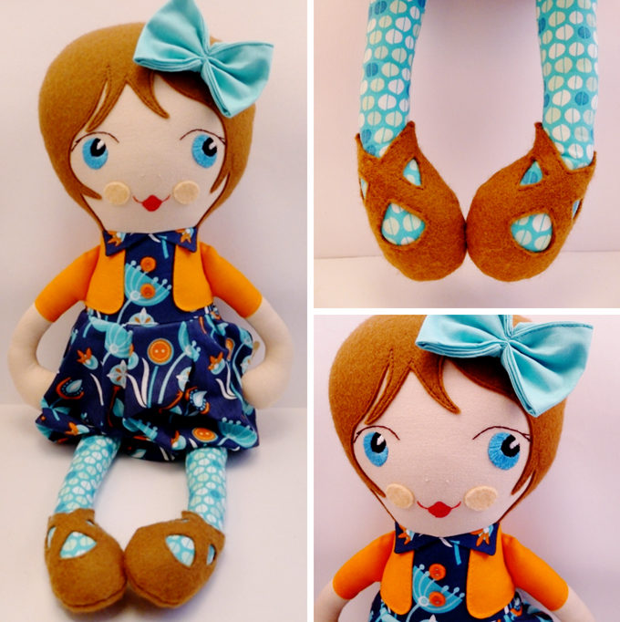 Ich nähe meine Puppen aus Baumwollstoffen und Wollfilz. Beide Materialien sind super geeignet. Baumwolle, weil es nicht so dehnbar ist wie Jersey und die Puppe dadurch schön in Form bleibt. Wollfilz, weil er sich für Haare und Schuhe optimal eignet.