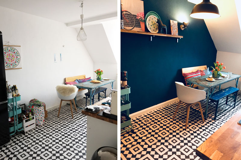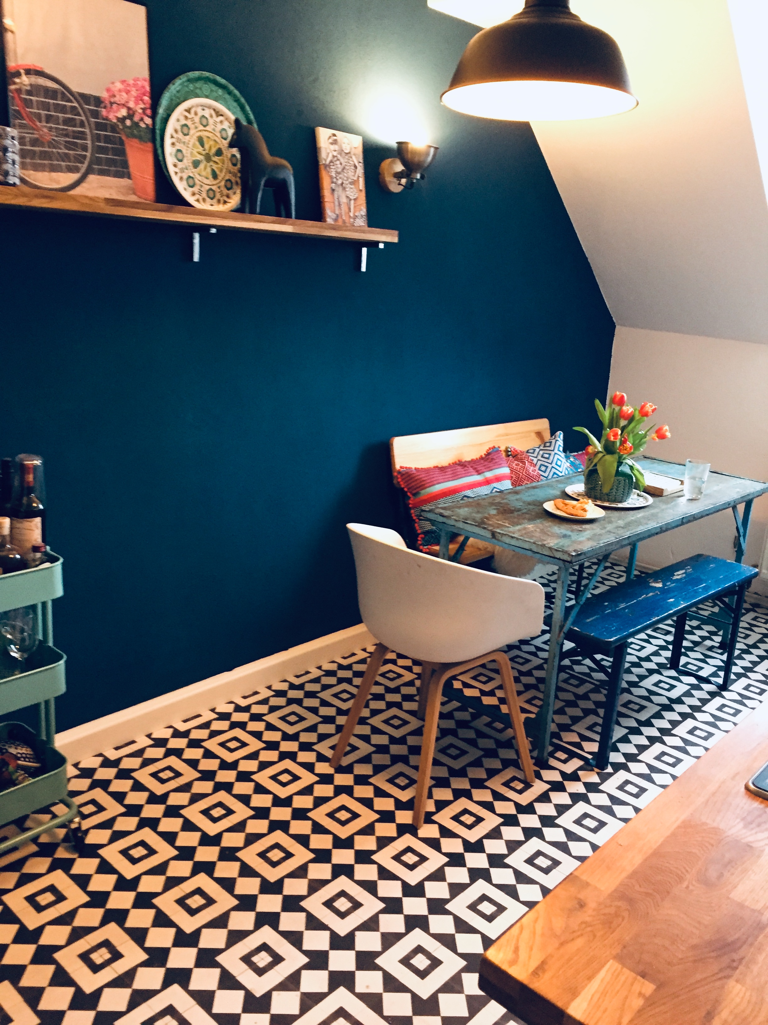 Und der Boden, den ich schon zum Einzug im Rahmen einer Blogger-Kooperation von Bricoflor bekommen habe, leuchtet jetzt auch noch viel mehr. Die Wandlampen habe ich relativ günstig aus dem Baumarkt. Ich finde die haben inzwischen ganz nette Leuchten. Und die schwarz Industrie-Hängelampe ist von Westwing. Die greift das Schwarz des Bodens – und des Kühlschranks – auf und erzeugt dadurch eine schöne Harmonie im Raum. Jetzt fehlt nur noch eine Kommode und eventuell ein Teppich (aber welche Farbe!?) und dann ist die Küche fertig.