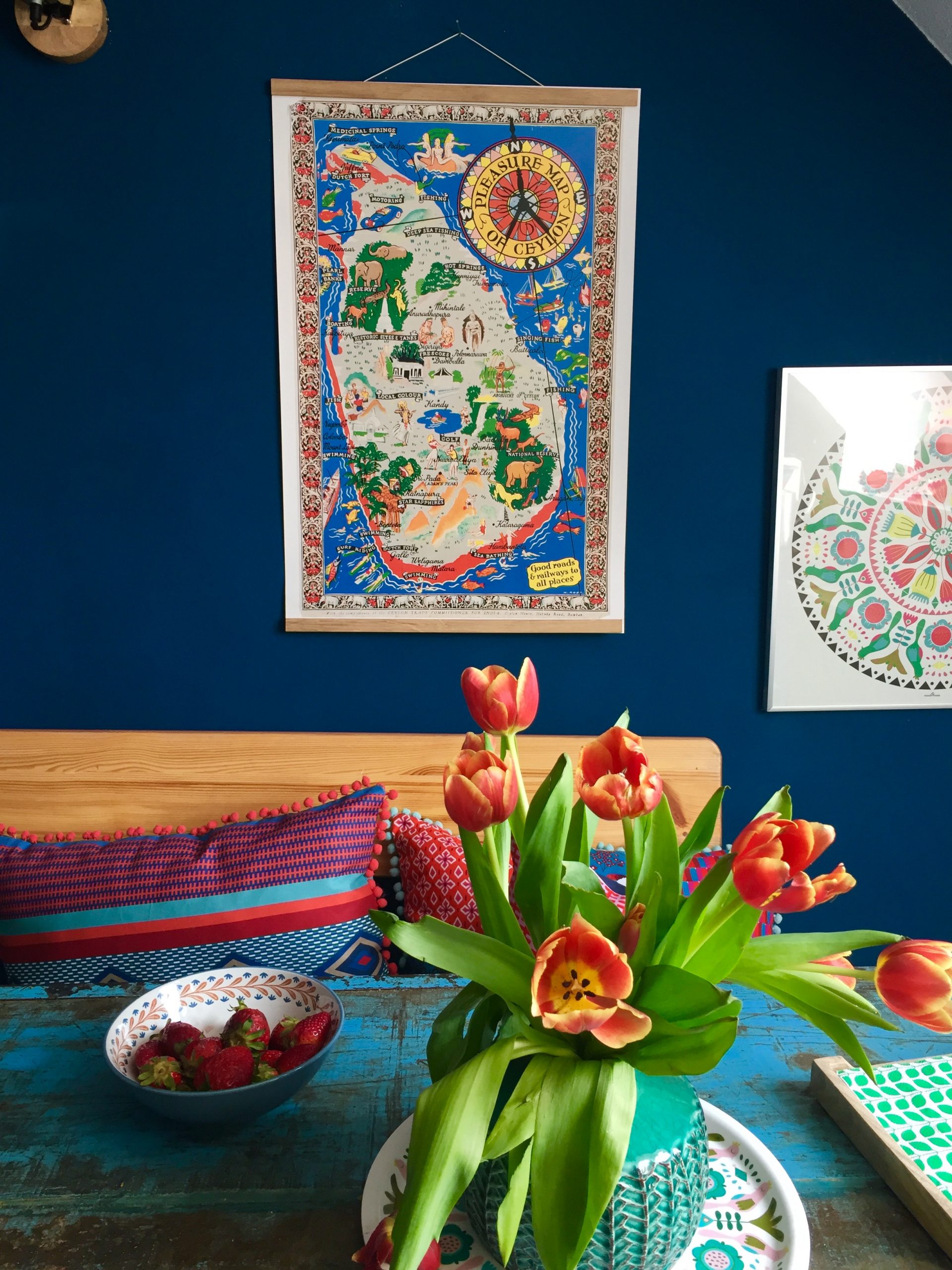Dabei geht so ein Schönermachen dann wirklich schnell und mit ein paar Handgriffen und relativ wenig Geld kann man schon so viel bewirken. Das habe ich am Wochenende wieder einmal festgestellt. Schon seit langem hatte ich die Vision einer dunkelblauen Wand in der Küche. Apropos Vision, die steht natürlich vor allem, denn ich brauche eine klare Vision für einen Raum, und bis die kommt kann das manchmal dauern. Außerdem muss das Raum-Für-Raum passieren, eine ganze Wohnung auf einmal hübsch zu machen würde mich – und vor allem meinen Geldbeutel – überfordern.